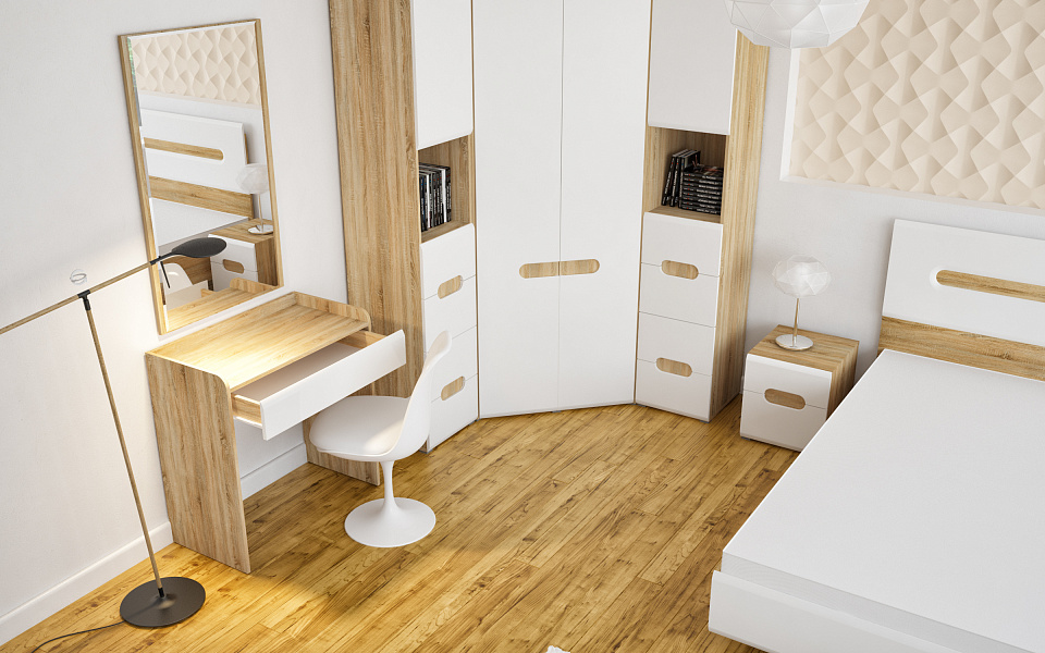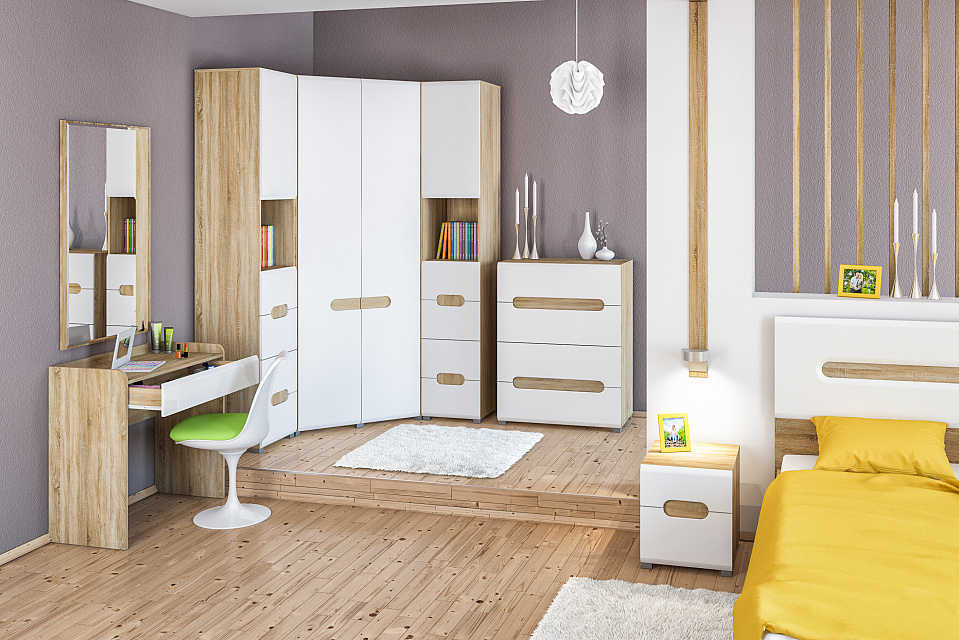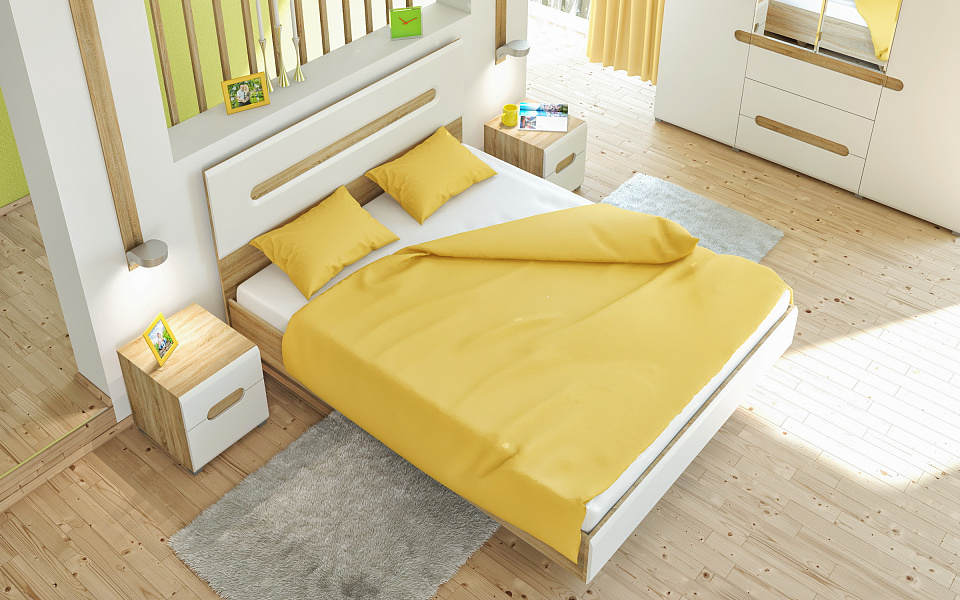Комплект включает в себя все элементы, необходимые для обстановки спальни – кровать, комод, зеркало, прикроватную тумбу и два вида шкафов для одежды.