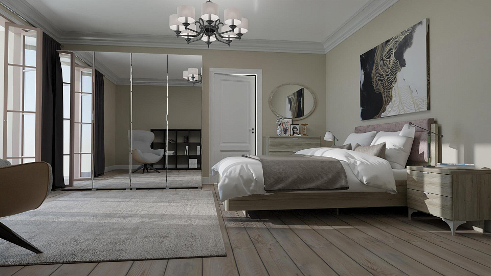 Фасадная часть - фрезерованная плита МДФ 16 мм под пленкой ПВХ и ЛДСП, декорированная зеркалами с обработкой фацет. В серии применены накладные ручки-профили 128 мм и ручки-скобы 96 мм (сатин светлый).