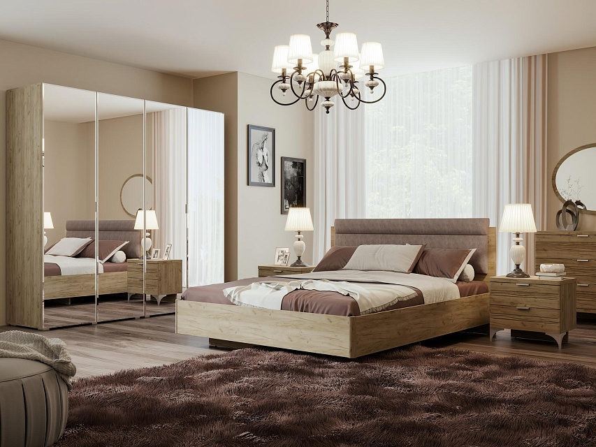 Материал корпуса - ЛДСП 16 мм. Задняя стенка выполнена из ХДФ, при этом в комодах, тумбах и ящиках она вставляется в паз. Выдвижные ящики снабжены шариковыми направляющими полного выдвижения. Тумбы и комоды комплектуются декоративными опорами 110 мм, а распашные шкафы - регулируемыми опорами L-20. Фрезерованные крышки комодов и тумб толщиной 32 мм облицованы кромкой ПВХ толщиной 1 мм. Изголовье кроватей - щит толщиной 32 мм с двумя подушками, обтянутыми экокожей либо микровелюром. Корпус кроватей представлен в двух вариантах: КР и КРП. КР - конструкция с анатомической решеткой; КРП укомплектована анатомической решеткой и вместительным бельевым ящиком с подъемным механизмом.