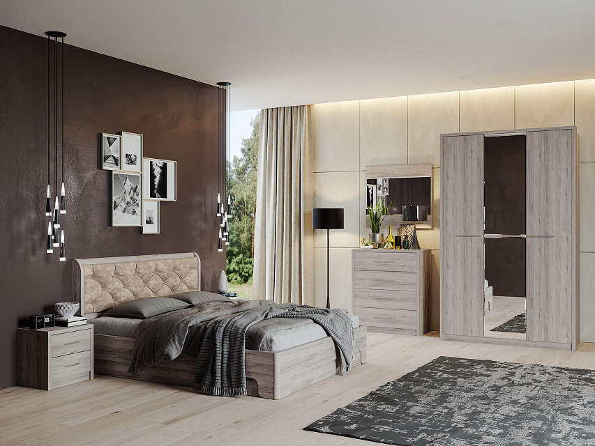 Корпус - ЛДСП 16 мм. В комодах и тумбах крышка толщиной 32 мм, направляющие полного выдвижения, задняя стенка из ХДФ в паз. Царги и изголовье кроватей выполнены из 32 плиты, на щитах кроватей используется каретная стяжка в стиле капитоне (ручная работа).