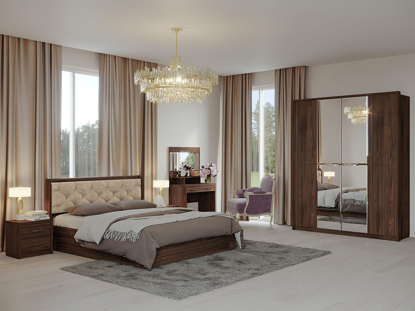 Корпус - ЛДСП 16 мм. В комодах и тумбах крышка толщиной 32 мм, направляющие полного выдвижения, задняя стенка из ХДФ в паз. Царги и изголовье кроватей выполнены из 32 плиты, на щитах кроватей используется каретная стяжка в стиле капитоне (ручная работа).