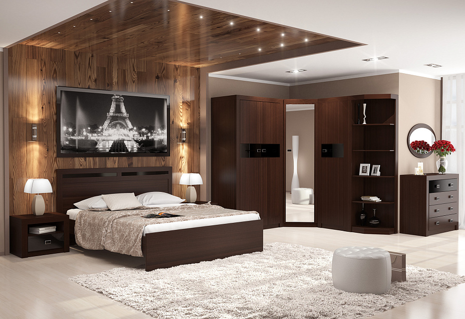 Оформление спальни Модена выполнено на контрастах: прямых и плавных изгибов, матовых и блестящих поверхностей – всё это создает очень тонкий и детальный интерьер, которому задаёт успокаивающий и уютный тон цветовое исполнение «орех вирджиния». Такое решение подойдет для людей с неординарным вкусом и любовью к изящному.
