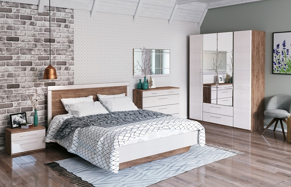 Каркасы выполнены из ЛДСП 16 мм в декоре "Дуб табачный крафт" и из МДФ 16 и 22 мм в цвете "Жемчужное дерево". Фасады из МДФ 22 мм в декоре "Жемчужное дерево". Регулируемые опоры. Шариковые направляющие полного выдвижения. Кровать комплектуется ортопедическим основанием на ножках. Ручки металлические, отделка алюминий анодированный. Петли с доводчиками.