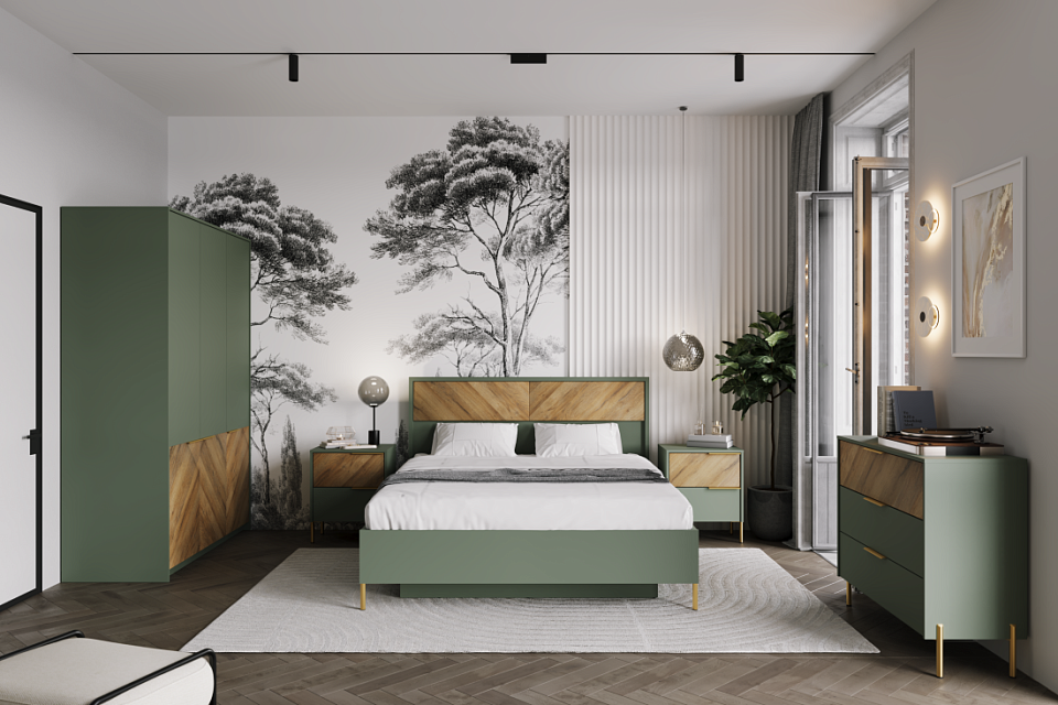 Изящное сочетание цветов натурального дерева и мягкого приглушенного зеленого колера сделают интерьер вашей гостиной индивидуальным и стильным. Легкость и современность коллекции придают металлические тонкие ручки и ножки в золотом цвете, невесомая LED-подсветка.