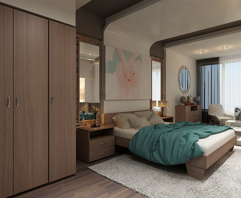 Современный интерьер спальни Слим Практик представлен в цвете "грецкий орех". Мебель изготовлена из ламинированного ДСП австрийского концерна Egger, сертифицированного в Беларуси.