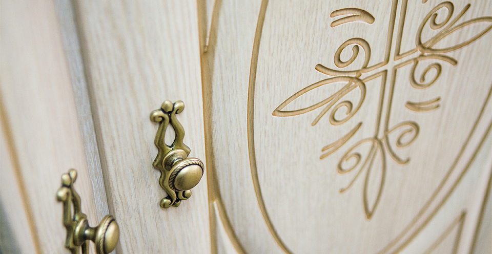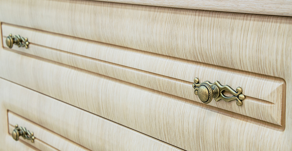 Особого внимания заслуживает качество изготовления фасадов из МДФ классического стиля. Пленка на них не отслаивается со временем, а сама мебель выглядит как массив. Все элементы комплектуются фурнитурой Hettich (Германия).
