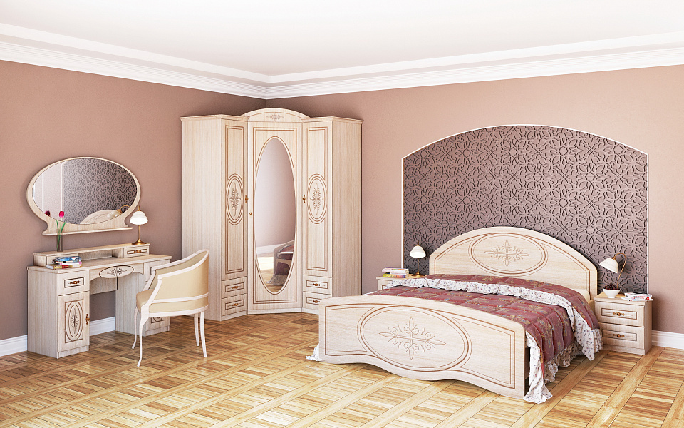 Популярная и недорогая классическая спальня! Отличное качество, внешний вид как у массива дерева. Патина на фасадах придает им особую глубину узора. Кровать с изножьем и без него. Угловой шкаф.