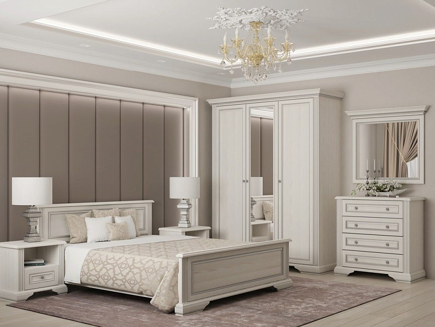 Набор мебели Вайт - классический комплект в современной интерпретации. Круглые металлический ручки, необычный и редкий насыщенный цвет "ясень снежный", массивные рамы, классический дизайн карниза - основные отличия системы.