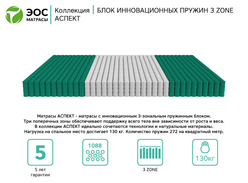 Инновационный блок, пружины которого, выполнены из стали различной степени жёсткости. Три поперечные зоны правильно распределяют нагрузку на спальное место, создавая идеальную поверхность, которая адаптируется под форму человеческого тела и обеспечивает максимально правильную поддержку. Ваше тело будет чувствовать поддержку каждой зоны, вне зависимости от роста и веса. Плотность размещения пружин – 272 пр/м2. |