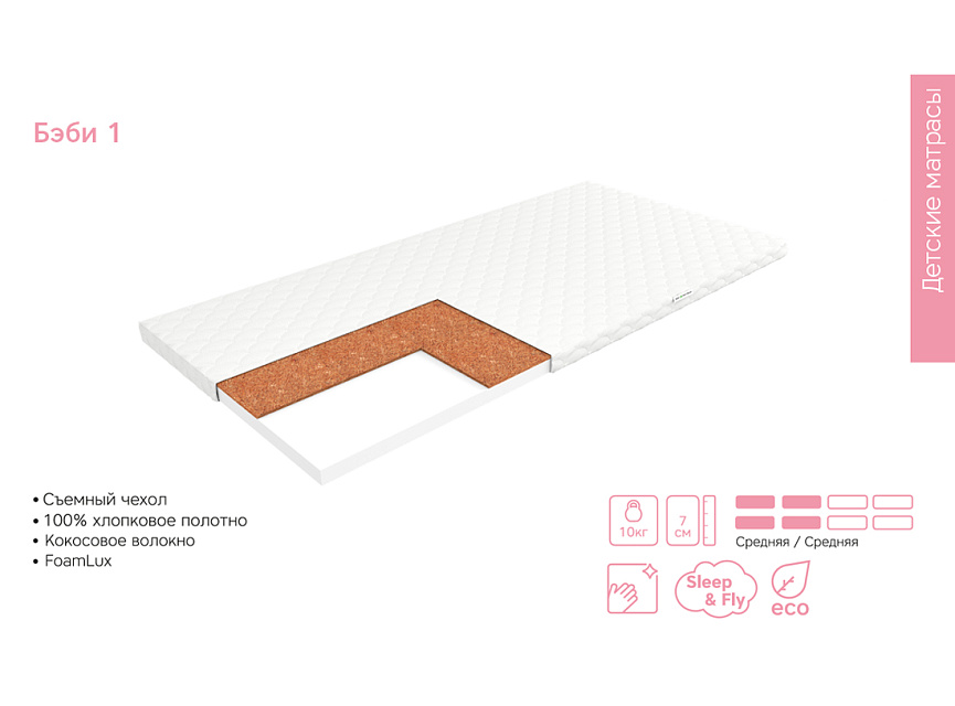 Натуральный гипоаллергенный материал. Благодаря пропитке из натурального латекса, волокна прочно скреплены в цельную плиту. Кокосовое волокно придает матрасу жёсткость и обладает бактерицидными свойствами. Производство – Enkev, Польша.