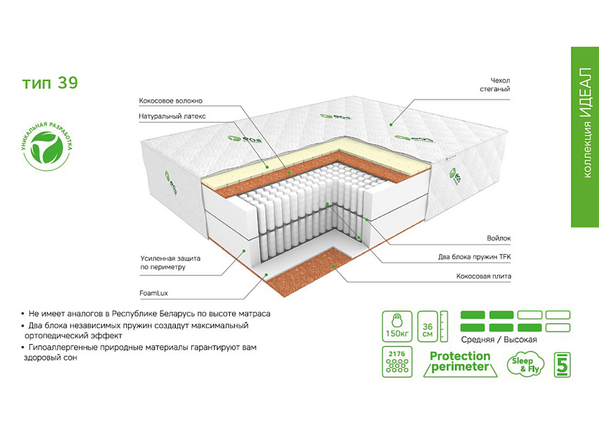 Латекс, Блок независимых пружин, Хлопковое полотно, Чехол, Войлок, FoamLux, Кокосовое волокно Enkev, Латексированная кокосовая плита