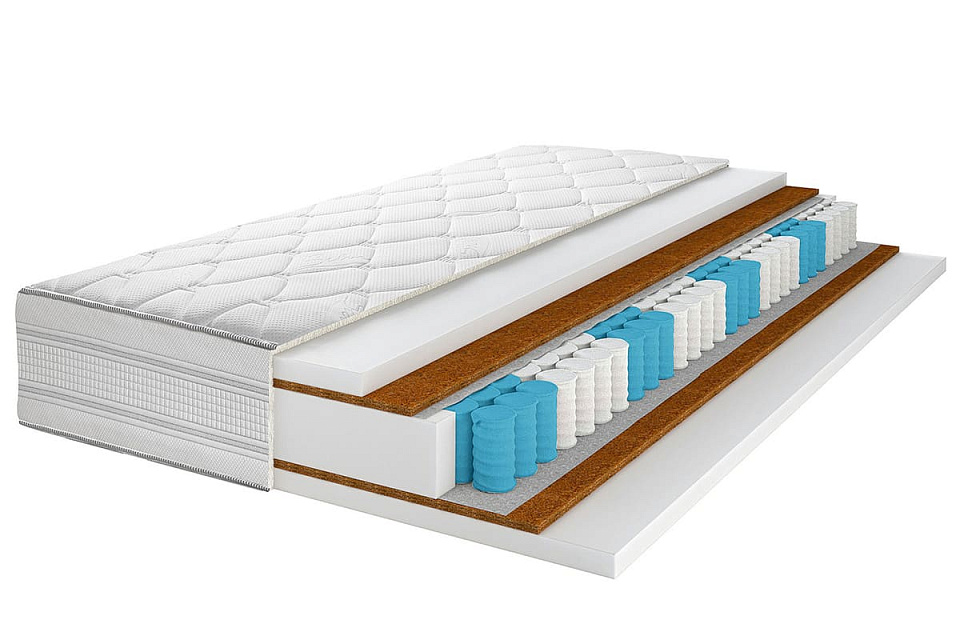 Кокосовая койра, Блок независимых пружин, Чехол, Высокоэластичная пена, Усиление по периметру матраса
