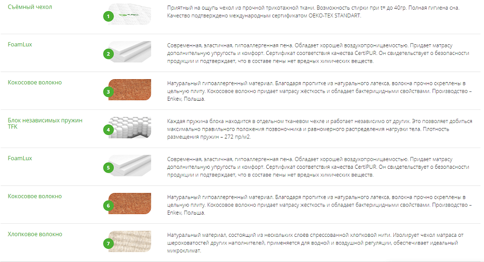 Блок независимых пружин, Хлопковое полотно, Чехол, FoamLux, Кокосовое волокно Enkev