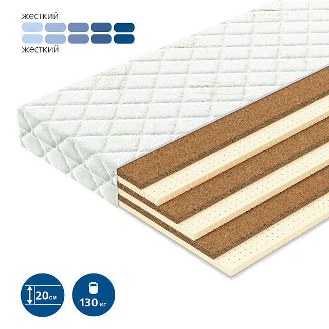 Натуральный материал, состоящий из спрессованных волокон кокосового ореха, полностью пропитанных латексом. Слои из прочной и долговечной кокосовой койры используются для придания матрасу дополнительной жесткости. |