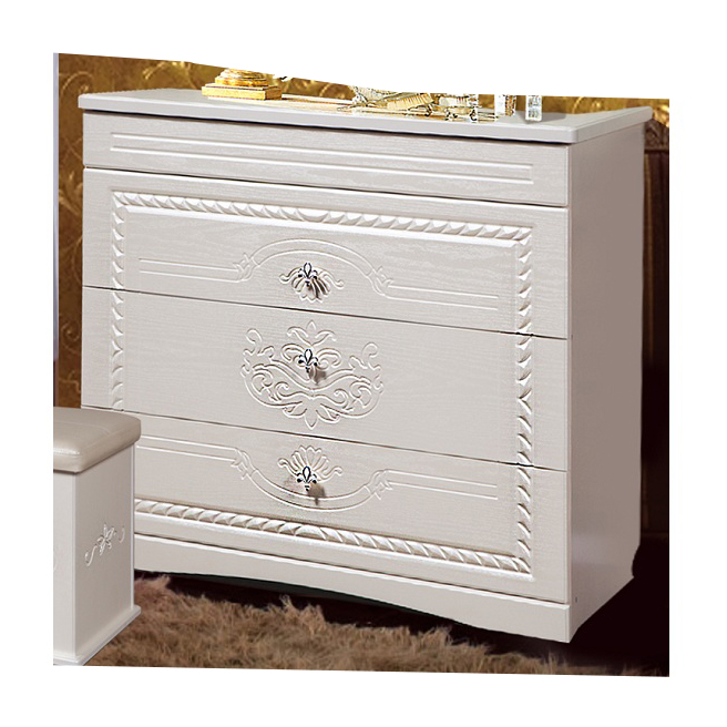 Четыре ящика на шариковых направляющих, петли без доводчиков, задняя стенка изготовлена из ХДФ. Крышка и фасад изготовлены из МДФ плёночного. Верхний ящик для небольших предметов нижние ящики более вместительные.