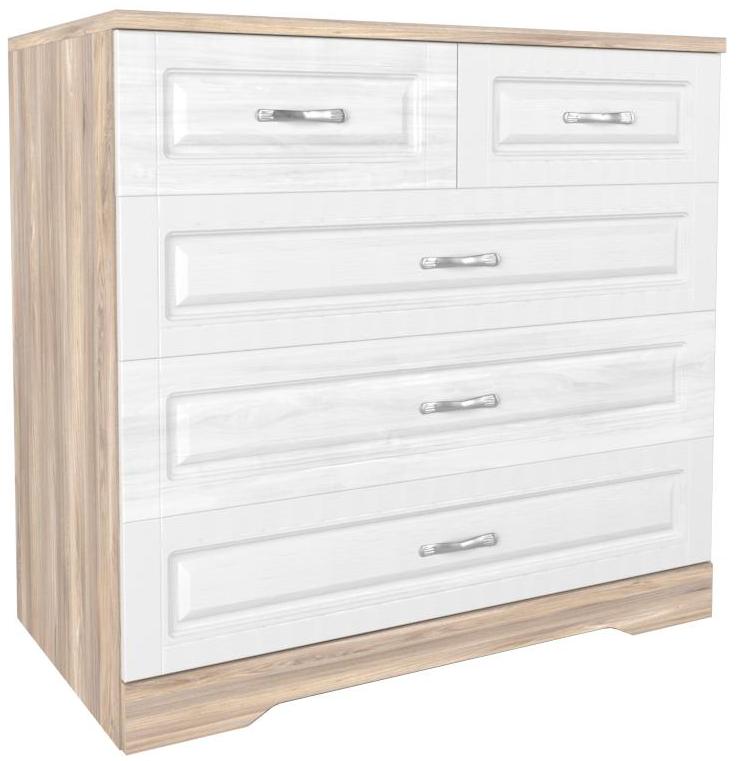 Четыре ящика на шариковых направляющих, задняя стенка изготовлена из ХДФ. Детали комода, которые в эксплуатации подвержены механическим повреждениям, облицованы кромкой ПВХ толщиной 2 мм. Верхний ящик один визуально стилизован под два.