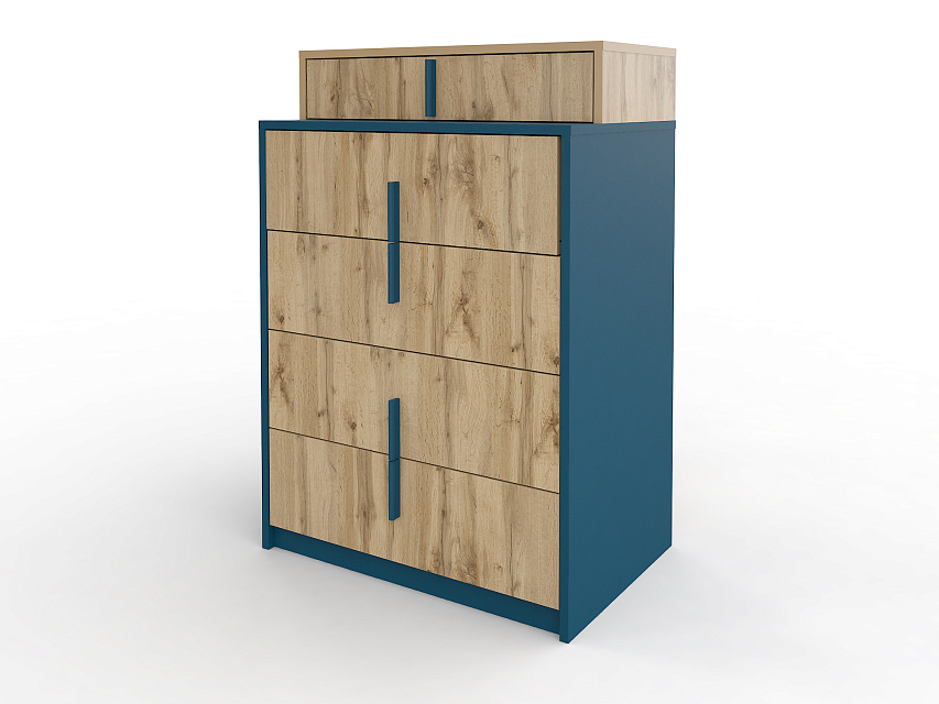 Привнести уют в комнату можно с помощью комода из коллекции Майами. Модель изготовлена из ламинированной ДСП двух цветов и имеет необычную форму. Верхний небольшой ящик пригодится для хранения всяких мелочей. В четырех больших ящиках можно держать постельное. белье или одежду. Все отсеки оснащены шариковыми направляющими, которые позволяют полностью их открывать. Сочетание синего цвета с древесиной придаёт модели неповторимый стиль и утончённость.