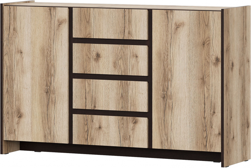 Посередине отделение с четырьмя выдвижными ящиками размером 376х100х350 мм, по краям располагаются два отделения размером 451х750х380 мм с распашными створками. Каждое отделение со створками комплектуется двумя съемными полками.