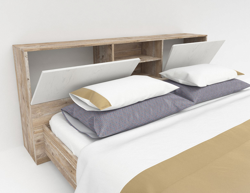Детали кровати, которые в эксплуатации подвержены механическим повреждениям, облицованы кромкой ПВХ толщиной 2 мм. Основание щитовое усиленное тремя силовыми опорами. Откидные двери кровати изготовлены из МДФ плёночного. За ними находится место для хранения постельных принадлежностей. Между дверями установлена несъемная полка.