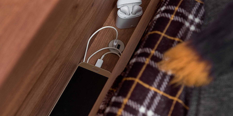 Детская или подростковая кровать-тахта с большим ящиком глубиной 182 мм на выкатных роликах. Его можно использовать как место для хранения постельного белья или как дополнительное спальное место для незапланированных гостей. Для полноценного спального места достаточно убрать разделитель и положить матрас. Размер матраса для основного спального места 190х90 см. Размер матраса для дополнительного спального места: 190х80 см, высотой до 18 см. Дополнительные боковые ниши в кровати помогут подростку держать под рукой необходимые перед сном вещи. Бонусом для современных детей станет компактная встроенная в кровать USB зарядка для телефонов и планшетов.