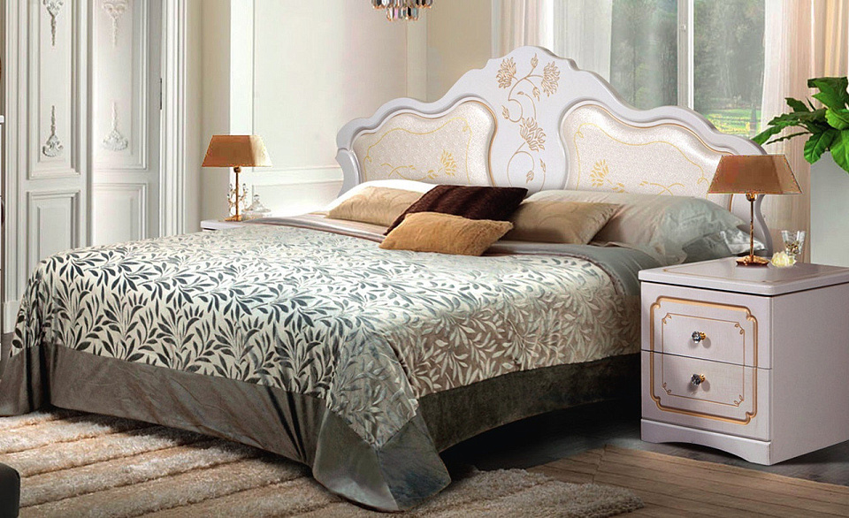 Мягкий элемент изготовлен из эко-кожи, устойчивость к истиранию 150 000 циклов. Детали кровати, которые в эксплуатации подвержены механическим повреждениям, облицованы кромкой ПВХ толщиной 2 мм. Основание щитовое усиленное тремя силовыми опорами. Головной щит декорирован золотой патиной с защитным водным покрытием.