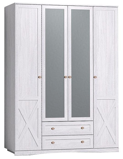 Вместительный 4-дверный шкаф для одежды и белья с продуманным наполнением - классический вариант шкафа для спальни. Он оснащен двумя отделениями для хранения белья с рядом полочек, выдвижными ящиками и отделением для одежды со стационарной штангой. Двери шкафа с зеркалами в обрамлении профиля и с декоративной раскладкой из МДФ станут настоящим украшением спальни. Зеркала проклеены специальной защитной пленкой – если они разобьются, осколки не разлетятся. Для декорирования шкафа используйте ADELE 51 Карниз, который докупается по желанию.