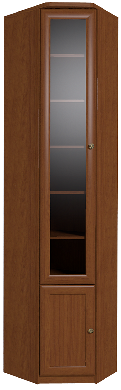 Высокий книжный шкаф для угловой композиции домашней библиотеки. Можно установить в комнату с высотой потолка не менее 250 см. Широкие треугольные полки позволят хранить в библиотеке папки с документами, шкатулки с семейным архивом и фотографиями. Высота полок во всех шкафах для книг регулируется, для этого необходимо только установить полкодержатели на нужной высоте в подготовленные отверстия. Это позволит поставить на полки книги и альбомы разного формата. Тонированное стекло защищает книги от вредного воздействия солнечных лучей и убережет их от пожелтения. Металлические ручки заменены с подвесок на гвоздики в декоре Старая латунь. Двери перенавешиваются на правую или левую сторону. Книжный шкаф обязательно крепится к стене за подвесы и межсекционной стяжкой с другими шкафами в наборе. Шкаф выпускается без выборки под плинтус, чтобы каждый мог прирезать плинтус индивидуально. В противном случае остаются неаккуратные зазоры между модулем и стеной.