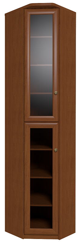 Высокий книжный шкаф для угловой композиции домашней библиотеки. Можно установить в комнату с высотой потолка не менее 250 см. Широкие треугольные полки позволят хранить в библиотеке папки с документами, шкатулки с семейным архивом и фотографиями. Высота полок во всех шкафах для книг регулируется, для этого необходимо только установить полкодержатели на нужной высоте в подготовленные отверстия. Это позволит поставить на полки книги и альбомы разного формата. Тонированное стекло защищает книги от вредного воздействия солнечных лучей и убережет их от пожелтения. Металлические ручки заменены с подвесок на гвоздики в декоре Старая латунь. Двери перенавешиваются на правую или левую сторону. Книжный шкаф обязательно крепится к стене за подвесы и межсекционной стяжкой с другими шкафами в наборе. Шкаф выпускается без выборки под плинтус, чтобы каждый мог прирезать плинтус индивидуально. В противном случае остаются неаккуратные зазоры между модулем и стеной.