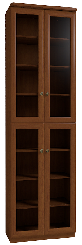 Высокий библиотечный шкаф с распашными дверцами. Данный шкаф можно установить в комнату с высотой потолка не менее 250 см. Высота полок во всех шкафах для книг регулируется, для этого необходимо только установить полкодержатели на нужной высоте в подготовленные отверстия. Это позволит поставить на полки книги и альбомы разного формата. Тонированное стекло защищает книги от вредного воздействия солнечных лучей и убережет их от пожелтения. Металлические ручки заменены с подвесок на гвоздики в декоре Старая латунь (фото ручек смотрите на специальном ракурсе). Книжный шкаф обязательно крепится к стене за подвесы и межсекционной стяжкой с другими шкафами в наборе. Библиотека выпускается без выборки под плинтус, чтобы каждый мог прирезать плинтус индивидуально. В противном случае остаются неаккуратные зазоры между модулем и стеной.