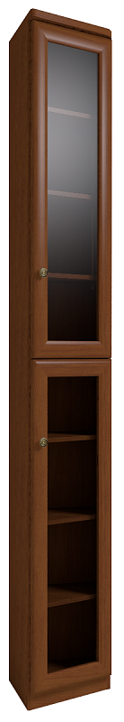 Высокий библиотечный шкаф со скосом гармонично завершает компоновку из шкафов, глубина зауженной части составляет 170 мм. Данный шкаф можно установить в комнату с высотой потолка не менее 250 см. Высота полок во всех шкафах для книг регулируется, для этого необходимо только установить полкодержатели на нужной высоте в подготовленные отверстия. Это позволит поставить на полки книги и альбомы разного формата. Тонированное стекло защищает книги от вредного воздействия солнечных лучей и убережет их от пожелтения. Металлические ручки заменены с подвесок на гвоздики в декоре Старая латунь. Книжный шкаф обязательно крепится к стене за подвесы и межсекционной стяжкой с другими шкафами в наборе. Библиотека выпускается без выборки под плинтус, чтобы каждый мог прирезать плинтус индивидуально. В противном случае остаются неаккуратные зазоры между модулем и стеной.