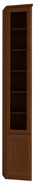 Высокий библиотечный шкаф со скосом гармонично завершает компоновку из шкафов, глубина зауженной части составляет 170 мм. Данный шкаф можно установить в комнату с высотой потолка не менее 250 см. Высота полок во всех шкафах для книг регулируется, для этого необходимо только установить полкодержатели на нужной высоте в подготовленные отверстия. Это позволит поставить на полки книги и альбомы разного формата. Тонированное стекло защищает книги от вредного воздействия солнечных лучей и убережет их от пожелтения. Металлические ручки заменены с подвесок на гвоздики в декоре Старая латунь. Книжный шкаф обязательно крепится к стене за подвесы и межсекционной стяжкой с другими шкафами в наборе. Библиотека выпускается без выборки под плинтус, чтобы каждый мог прирезать плинтус индивидуально. В противном случае остаются неаккуратные зазоры между модулем и стеной.