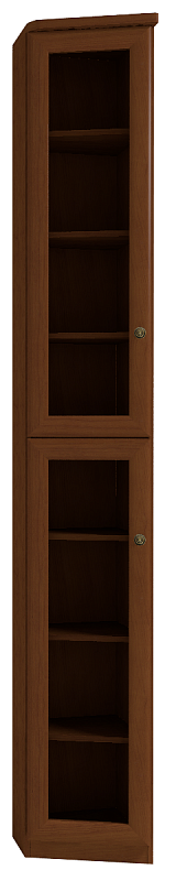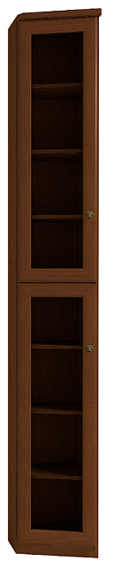 Высокий библиотечный шкаф со скосом гармонично завершает компоновку из шкафов, глубина зауженной части составляет 170 мм. Данный шкаф можно установить в комнату с высотой потолка не менее 250 см. Высота полок во всех шкафах для книг регулируется, для этого необходимо только установить полкодержатели на нужной высоте в подготовленные отверстия. Это позволит поставить на полки книги и альбомы разного формата. Тонированное стекло защищает книги от вредного воздействия солнечных лучей и убережет их от пожелтения. Металлические ручки заменены с подвесок на гвоздики в декоре Старая латунь. Книжный шкаф обязательно крепится к стене за подвесы и межсекционной стяжкой с другими шкафами в наборе. Библиотека выпускается без выборки под плинтус, чтобы каждый мог прирезать плинтус индивидуально. В противном случае остаются неаккуратные зазоры между модулем и стеной.