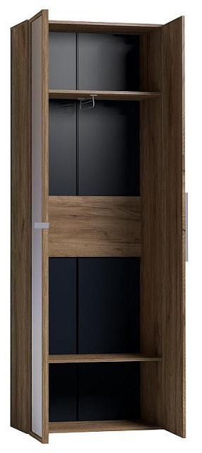 Двухдверный распашной шкаф с одним глухим фасадом и одним зеркальным фасадом в раме. Глухой фасад с серой ручкой из массива, фасад Зеркало Контур открывается за ручку-петлю из высокопрочной микрофибры. Регулируемые опоры компенсируют незначительные неровности пола.