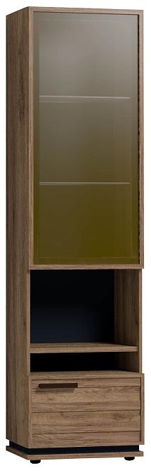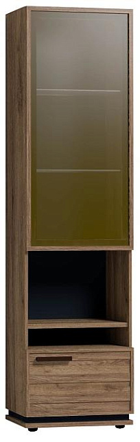 Высокий шкаф для посуды удобен своей функциональностью и эргономичностью конструкции. За тонированным стеклянным фасадом - 2 регулируемые по высоте бесцветные стеклянные полки. Витрина открывается за боковой свес. На открытой полке разместите фотографии или элементы декора, а за глухим откидным фасадом спрячьте документы и ценные вещи от посторонних глаз. Регулируемые опоры шкафа позволят компенсировать незначительные неровности пола. К шкафу можно докупить подсветку.