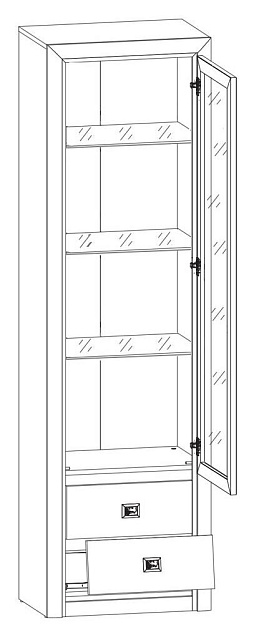 - Шкаф имеет одно вертикальное отделение с тремя вкладными стеклянными полками и отделением с двумя выдвижными ящиками;