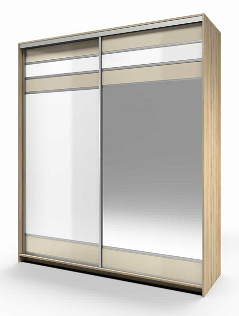 На шкаф установлен механизм шкафа купе Сенатор. Правая дверь изготовлена из зеркальной вставки и вставки из комбинации стекла светлого и темного. Левая дверь изготовлена из комбинации стекла лакобель светлого и темного. Лакобель представляет собой специальным образом окрашенное стекло. Детали шкафа, крышка, боковые стенки, которые в эксплуатации подвержены механическим повреждениям, облицованы кромкой ПВХ. В правой и левой части шкафа за дверями штанга для одежды, также в правой части шкафа за дверями установлены ящики на шариковых направляющих H=35 AKS LIGHT. Система раздвижения Сенатор обеспечивает плавное и бесшумное скольжение дверей и создаёт эффект парения в воздухе.