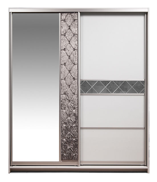На шкаф установлен механизм шкафа купе Сенатор. Левая дверь изготовлена из зеркальной вставки и вставки из Эко кожи с использованием технологии «Каретная стяжка», устойчивость к истиранию 150 000 циклов. Правая дверь изготовлена со вставками из зеркала с гравировкой в форме ромбов и стекла лакобель белого цвета. Лакобель представляет собой специальным образом окрашенное стекло. Детали шкафа, крышка, боковые стенки, которые в эксплуатации подвержены механическим повреждениям, облицованы кромкой ПВХ. В правой и левой части шкафа за дверями штанга для одежды, также в правой части шкафа за дверями установлены ящики. Система раздвижения Сенатор обеспечивает плавное и бесшумное скольжение дверей и создаёт эффект парения в воздухе.