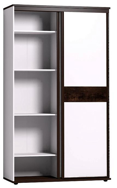Небольшой шкаф-купе в прихожую с продуманным внутренним наполнением позволяет рационально использовать площадь небольшого коридора в квартире. В комплектацию шкафа входят: выдвижная штанга и регулируемые по высоте полки для одежды. Два фасада - зеркальный и глухой - перемещаются на стальной системе Найди, которая обеспечивает легкость открывания, плавность и бесшумность хода. Зеркальный фасад проклеен с обратной стороны защитной пленкой. Шкаф-купе создан на контрасте: белый корпус, белый глухой фасад и горизонтальные детали в декоре Орех Шоколадный, трек и профили цвета венге, темная брашированная вставка из дерева. Регулируемые опоры компенсируют незначительные неровности пола.