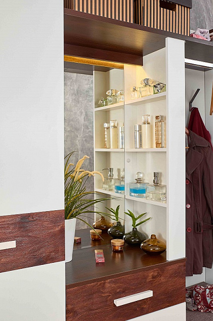 Многофункциональный шкаф Норвуд 70 - находка для маленькой прихожей. В небольшом по габаритам модуле (шириной 1120 мм и глубиной 400 мм) сочетается всё необходимое: крючки, стационарная штанга, открытые полки, выдвижные ящики, отделение за откидным фасадом, открытая ниша, зеркало с подсветкой. Встроенная светодиодная подсветка включается при помощи аккуратного кнопочного выключателя. Откидной фасад дополнительно фиксируется при закрывании магнитной защелкой. Горизонтальные детали толщиной 22 мм в декоре Орех Шоколадный и фасад верхнего ящика из дерева с брашировкой контрастируют с белым декором модуля. В комплектацию входит мягкое сидение, которое позволит обуваться с комфортом. Регулируемые опоры помогут компенсировать неровный пол в прихожей. Собрать Шкаф МЦН можно как на правую, так и на левую сторону.