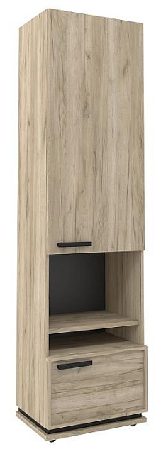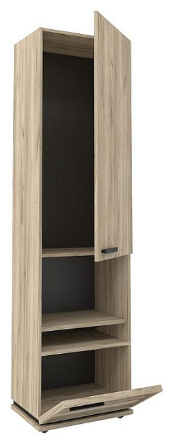 Компактность высокого шкафа МЦН сочетается с вместительностью, что идеально подходит даже для небольших гостиных. Это удобный и многофункциональный тип мебели для хранения. Его фасады перенавешиваются. На открытой полке можно разместить фотографии, книги или элементы декора, а за глухими фасадами спрятать личные вещи от посторонних глаз. Регулируемые опоры шкафа позволят компенсировать незначительные неровности пола. А двойной контрастный цоколь – интересная фишка.