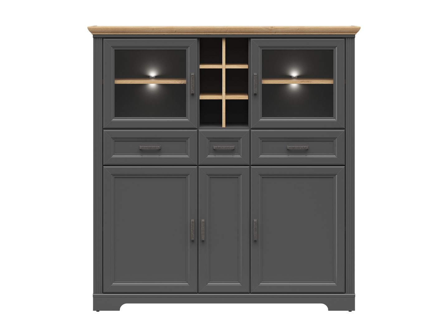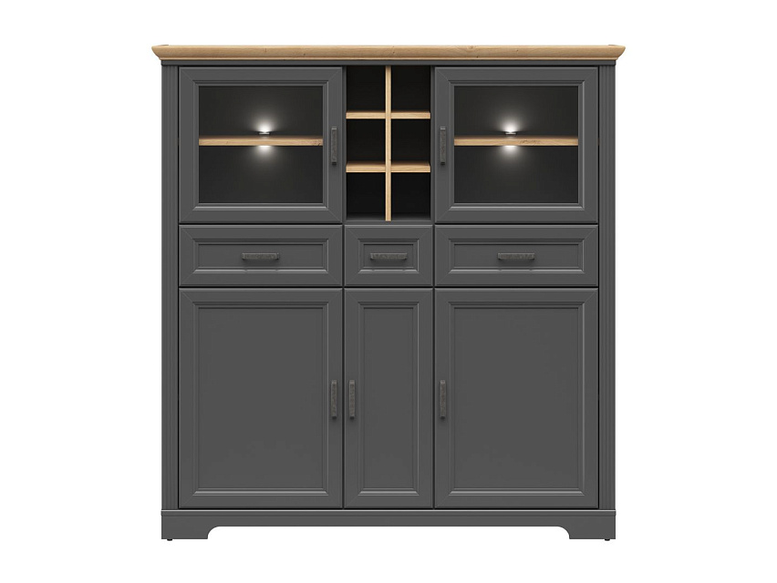 - в верхней части шкафа расположены: 2 отделения для хранения за стеклянными дверями, открытое отделение с ячейками