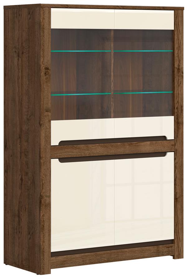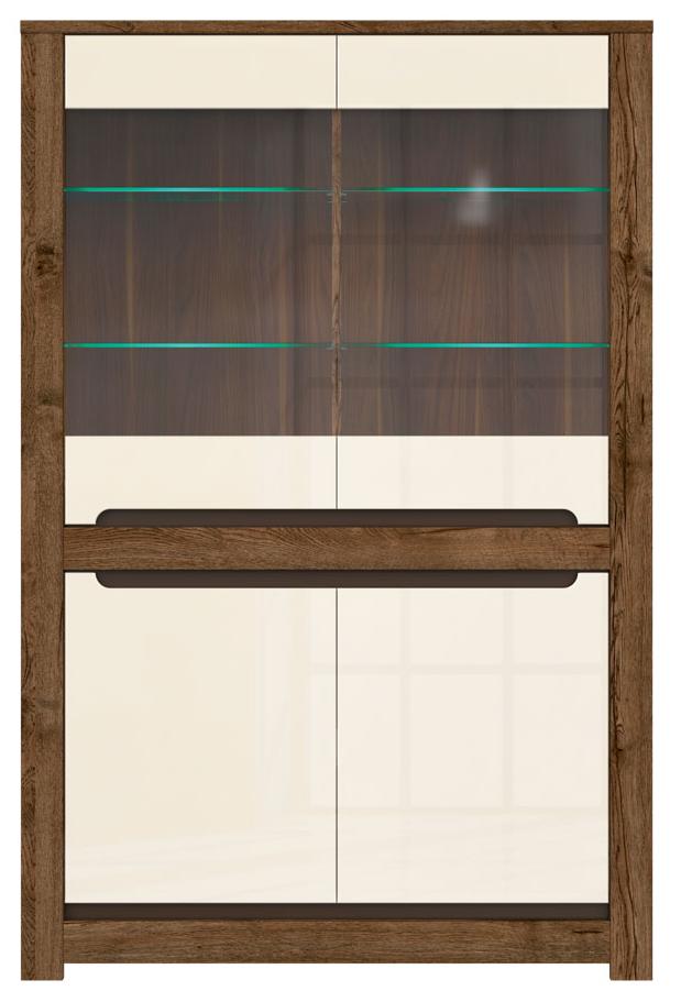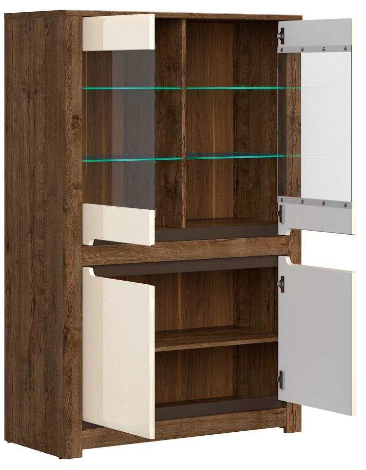 - Шкаф разделен на 2 отделения: отделение со стеклянными полками за дверьми со стеклянной вставкой и отделение с полками за распашными глухими дверями;