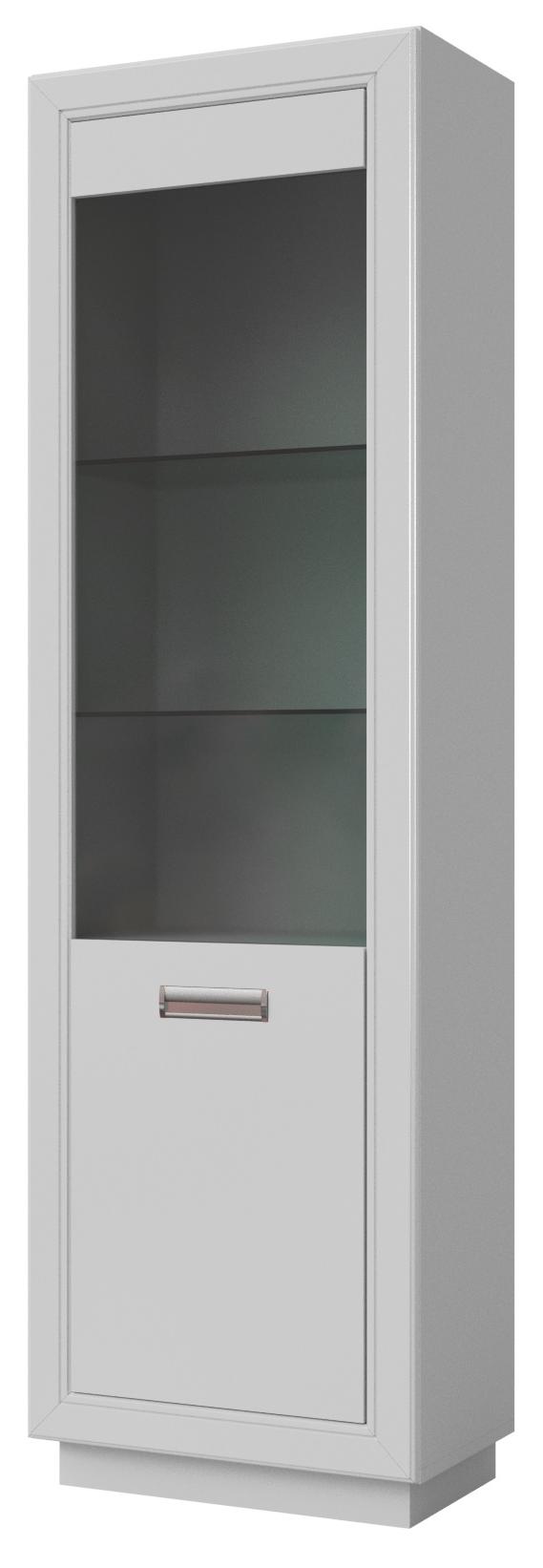 Петли без доводчиков, задняя стенка изготовлена из ХДФ. В витрине за дверью три съемные полки, две из которых стеклянные Детали конструкции фасада изготовлены из МДФ пленочного. Витрина установлена на подиуме.