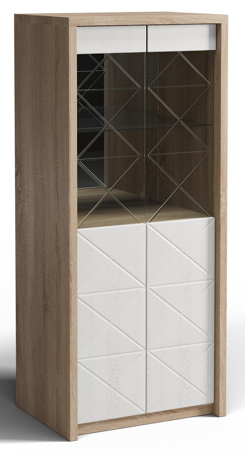 Петли без доводчиков, задняя стенка изготовлена из ХДФ. За дверью установлены одна съемная полка из стекла и две несъёмные. Дверь изготовлена из МДФ плёночного и стекла с фацетом 20 мм по двум длинным сторонам и с гравировкой. Функцию ручки выполняет фрезеровка выемка в торце фасада. Каркас из ДСП толщиной 32 мм придает эффект добротности и надёжности конструкции мебели. При желании петли с доводчиками можно приобрести дополнительно и самостоятельно установить их.