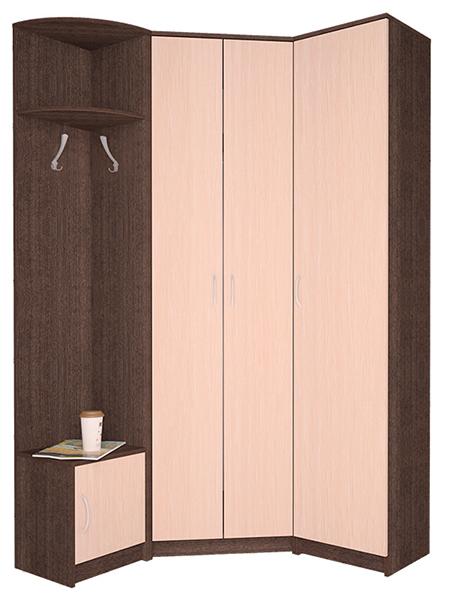 Угловой вариант прихожей, имеющий зону с крючками для одежды, глубокий шкаф с трубой для вешалок и огромным количеством полок для хранения вещей.