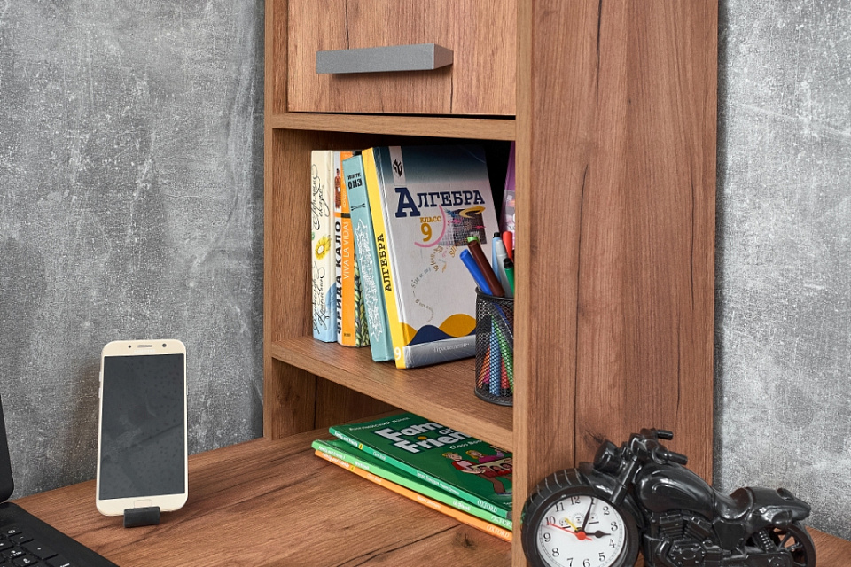 Два небольших ящичка, открытые полки и ниши стеллажа-надстройки к модулю Nature 84 Cтол письменный помогут организовать рабочее место так, чтобы все было под рукой. Надстройка с фигурными закругленными краями может собираться на правую и левую сторону из одного комплекта деталей.