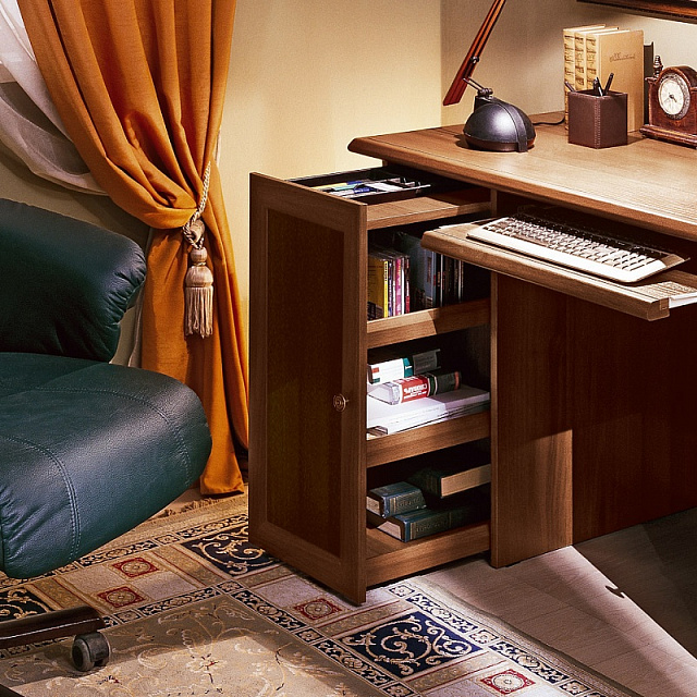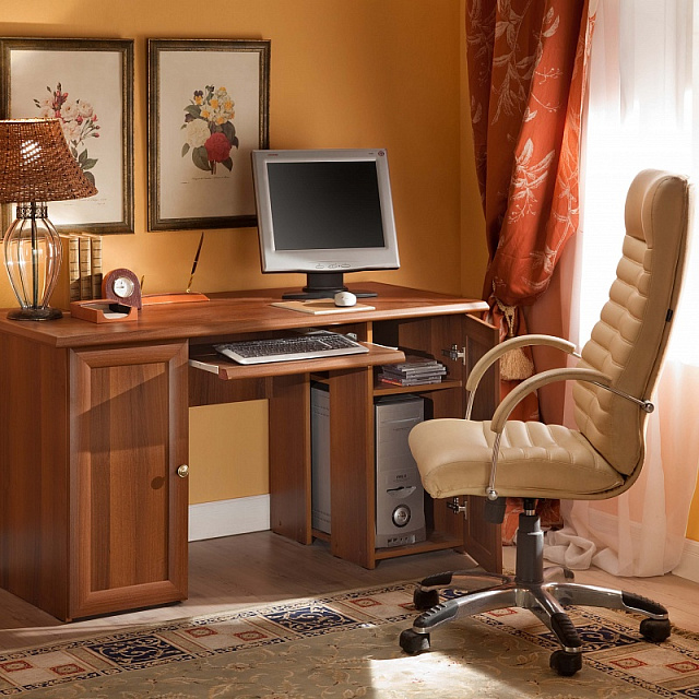 Удобный письменный стол для дома или офиса. Широкая столешница обрамлена в профиль МДФ. Слева под столешницей располагается выдвижной модуль с тремя полочками. На них легко рассортировать документы и папки, а ограничитель из профиля МДФ не даст им упасть. Высота свободного пространства между полками - 197 мм, высота свободной площади над самой верхней полочкой - 43 мм. На ней закрепляется лоток под канцелярские принадлежности, можно положить телефон или планшет. За распашной дверцей справа ниша с двумя полками. Их можно не устанавливать. В таком случае ниша представляет собой вентилируемое отделение для системного блока. Под столешницей находится выдвижная панель для клавиатуры.