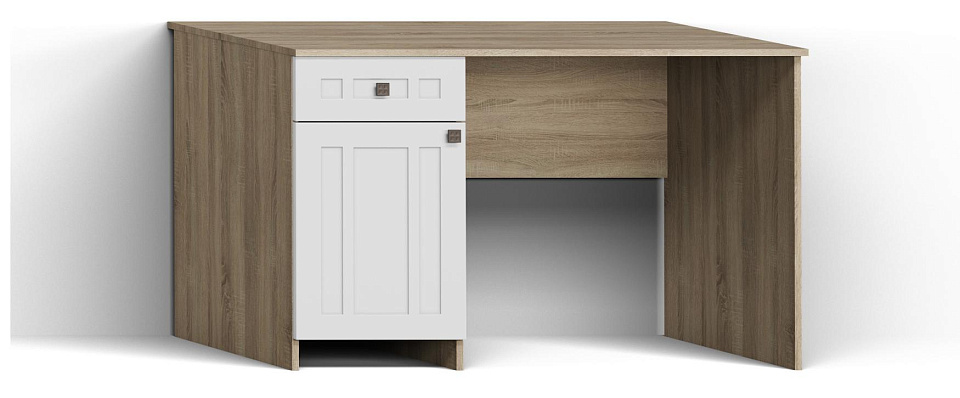 Ящик на шариковых направляющих, петли без доводчиков, задняя стенка изготовлена из ХДФ. При желании петли с доводчиками можно приобрести дополнительно и самостоятельно установить их. Фасад из МДФ плёночного с патинированием. Детали стола, которые в эксплуатации подвержены механическим повреждениям, облицованы кромкой ПВХ толщиной 2 мм. За дверью установлена одна съемная полка.