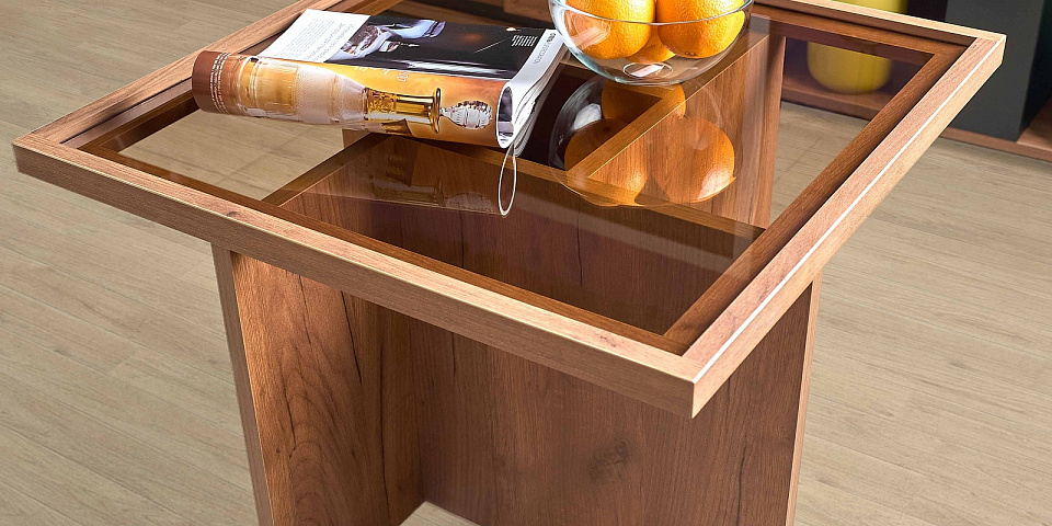 Квадратный журнальный столик в декоре Дуб Табачный с тонированной столешницей удачно дополнит гостиную в стиле лофт. Перемещение стола не составит труда, так как столик устанавливается на колесные опоры.