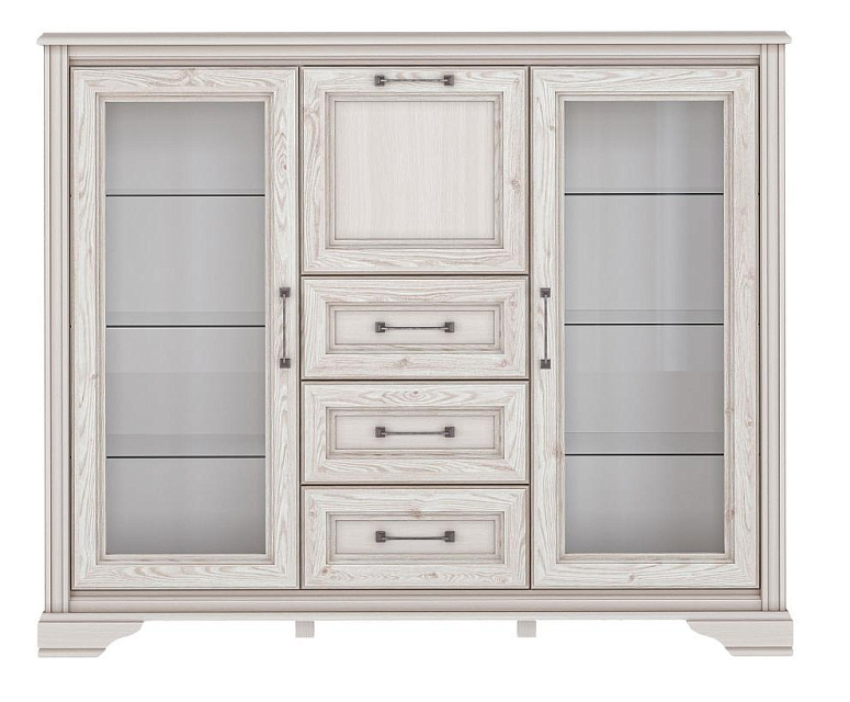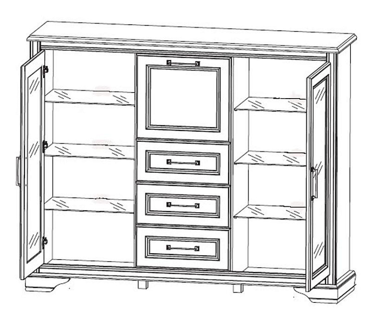- По обе стороны 2 двери со стеклянными вставками, за которыми расположены стеклянные полки;